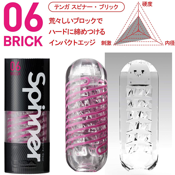 洗って繰り返し使えるお洒落なテンガ「テンガスピナー」に新作登場!ストロークに連動して捻り運動が加わる同シリーズの06ブリックは、ダイヤのように角ばったブロック状の突起が全体を締め付ける高刺激構造。使用後はお部屋のインテリアとして飾っても格好いい!付属品にテンガスピナーと相性の良い「TENGA HOLE LOTION」シリーズのリアルローション1回分を同梱。