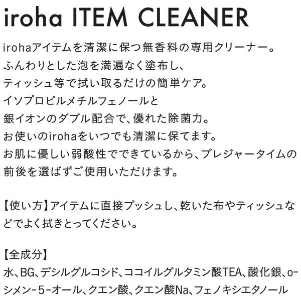 銀イオンとイソプロピルメチルフェノールのW配合で優れた除菌力を発揮!肌に優しい弱酸性仕様のiroha専用クリーナー50ml。ワンプッシュで出てくるふんわり泡を万遍なく塗り、布やティッシュで拭き取るだけの簡単ケア♪ボトルはインテリアに馴染むお洒落デザイン。