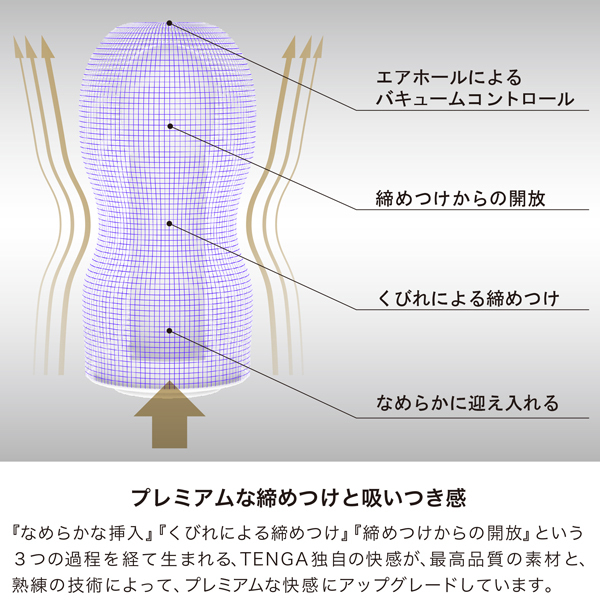 好評を博したプレミアム テンガにソフトエディションが登場。素材、技術、快感、そのすべてが最高品質。特別に配合された最高品質のゲル、しっとりと包み込む高級ウレタンフォーム、拭き取りやすいプレミアムローション、専用に設計された贅沢な内部ディテールと、それを実現する金型技術や成型技術。PREMIUM TENGA SERIESは、厳選された最高品質の素材と、長年培われた熟練の技術によって生まれたワンランク上のCUP SERIESです。優しく包みこまれる至極のソフト設計くびれ効果で、プレミアムな吸いつき感。ベースとなるゲルの肉厚をスタンダードカップの1、5倍に再設計したことで、緻密な絡みつきとしっとり滑らかな挿入感に進化しました。最高品質の素材と15年培ってきた技術によってリニューアルされた、プレミアムソフトな至極の快感をぜひお楽しみください。