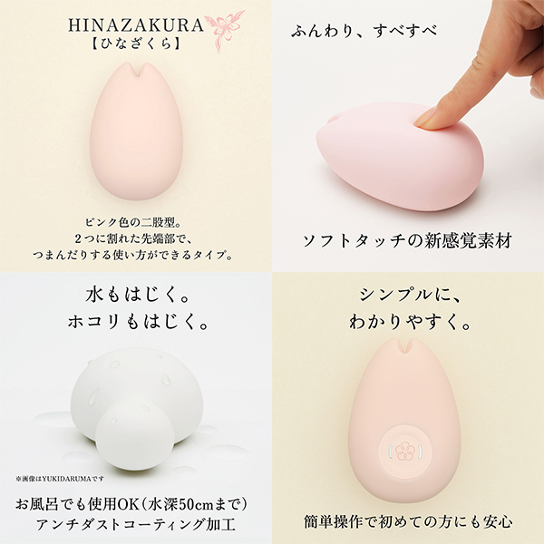 晴れ晴れと、気持ちよく。体へのあたりがやさしい、ふんわりソフトな肌ざわりが好評のセルフプレジャー・アイテムirohaがリニューアル。驚きの静音設計と、シンプルで使いやすい機能設計はそのままに、形状やボタン設計を見直し、リズムパターンを1種類追加しました。今までよりもさらに使いやすくなったirohaは、これからも、すべての女性に気持ちよさを届けます。新しくなったirohaで、晴れやかなセルフプレジャーを、ご体感ください。振動を楽しむのに加えて、2つに割れた先端部で、つまんだりする使い方できます。ひなざくら