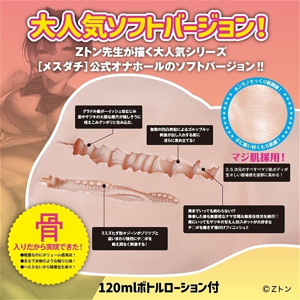Zトン先生が描く大人気メスダチ公式オナホール今回も前回に続き、更に柔らかプルルンッ?ソフトバージョンで登場!生意気ボーイッシュ娘のわがままボディを再現するために、こんなところに拘りました!◎パッケージイラストはZトン先生描きおろし!◎マガこれ独自素材「マジ肌」採用。マガこれでしか味わえないリアルな触感が没入感を高めます!◎全長55センチで大満足の抱き心地。◎大型ボディホールなのに重量は12.3kgと扱いやすい!◎「大きいのに軽い」を実現した独自構造骨格を採用。垂れずにあらゆる体位で使えます。◎従来の素材より更に柔らかく!サツキの柔肌を再現!◎運動神経抜群のサツキのボディを再現したスポーティー美クビレボディ!◎魅惑の2穴構造!もちろんそれぞれ独自の内部構造となっています。◎120mlボトルローション付き