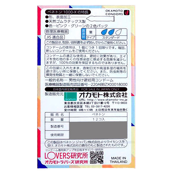 鮮やかなマルチカラーが目を引くオシャレパッケージ!イタリアの有名ブランド「ベネトン」とコラボした、ファッショナブルなオカモト製コンドーム(12個入り)。ジェルがたっぷり塗布されているので、装着も挿入も手間取らずにスマート!個包装パッケージにもベネトンのロゴマーク入りなので、クールにキメたい夜にピッタリです。ピンクとグリーンの二色入り。