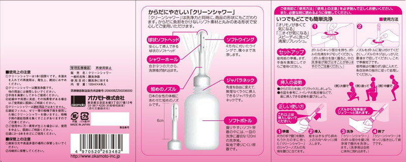 デリケート部分を優しく洗浄!初めての方にも安心してお使いいただける、携帯に便利な使い切りビデ「クリーンシャワー」(4本入り)です。挿入部はソフト素材の丸い形状になっており、体にかかる負担を軽減。生理の終わりかけやオリモノの多い日を始め、ラブタイム前やプール&海水浴後の洗浄をトイレやお風呂場で済ますことができます。週2、3本を目安に無理のないご使用を。