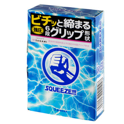ビチッと締まる強圧!まるでギュッと握られているような締め付け感のサガミブランドコンドーム「SQUEEZE(スクイーズ)」5個入。サガミ社独自の波打つような6段グリップ形状タイプ!絞り部分の直径が27mmと一般的な製品よりも細めなので男性器にしっかり密着&刺激!使用中の脱落も防止しながら、タイトなフィット感と強い締め付け感を楽しめます。なめらかな使用感が得られる潤滑剤付き、ピンクカラーのラテックス製コンドームです。