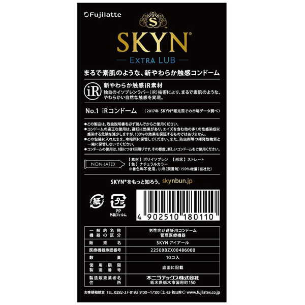 高品質な避妊具をお探しの方に!潤滑ゼリーをたっぷり配合したSKYN新作「エクストラリューブ」10個入り。ゴム特有の臭みがなく、着けていることを忘れてしまうほど肌馴染み抜群!挿入もスムーズで、摩擦をかけても乾きにくいためプレイに集中できます♪素材にはIR素材(イソプレンラバー)を使用。高級感のあるスタイリッシュなパッケージにも注目です!不二ラテックス製