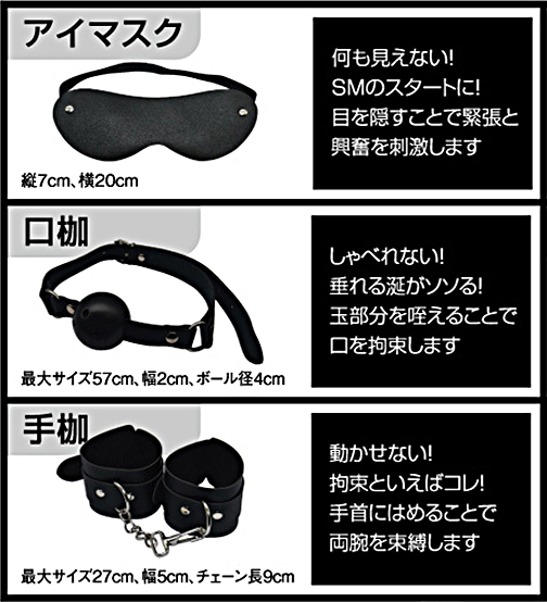 好きなあの子をいいなりに……。これひとつでSMプレイを網羅する豪華8点セット!SMプレイをスタートしたい、ビギナーなアナタにぴったりなSMグッズセットです。視覚を奪って緊張感が高まる「アイマスク」言葉を塞いで垂れる涎がそそる「口枷」動きを束縛する本格派拘束「手枷」身を捩る動きが音を奏でる「乳首クリップ」叩いた音が嗜虐を煽る「バラムチ」。SMプレイをすぐに始められる、厳選の全5アイテムです。