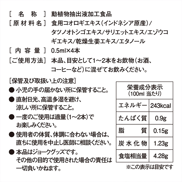 【悪用厳禁】ですよ!人気の女性向けリキッド「濡れアワビ」シリーズに新商品が登場♪お酒やジュースに混ぜて飲もう!スッキリとした味わいでドリンクに混ぜたことも忘れるほどの飲みやすさ♪「原材料名」食用コオロギエキス、タツノオトシゴエキス、サリエットエキス、エゾウコギエキス、乾燥生姜エキス、エタノール。「内容量」0.5ml×4本。「ご使用方法」本品、目安として1〜2本をお飲物(お酒、コーヒーなど)に混ぜてお飲みください。