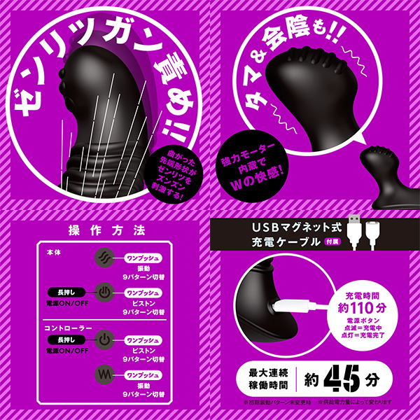 ★超強力ピストンで完堕ちメス堕ち新境地★PPPより、超強力ピストン搭載で、完全防水&遠隔操作可能なアナニーバイブ第2弾が登場!ピストンギミックはゼンリツをズンズン刺激するメス堕ち構造!先端の曲がった形状がゼンリツをガン責め!9パターンの高速ピストンで止まらない&止められないイキ狂い!タマ&会陰を刺激する強力モーター内蔵でWの快感を味わえちゃう!女の子みたいにイケるメス堕ち仕様の優秀バイブ!いろんな遊び方を模索して、もっと新しい快感を見つけてくださいね!※本体:充電時間約110分※本体:連続稼働時間約45分(初期振動パターン未変更時)IPX7等級 9パターン振動 付属品:リモコン_USBマグネット式充電コード