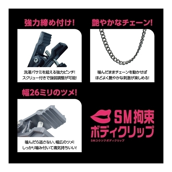 好きなあの子をいいなりに……。SMプレイを盛り上げるアイテム、SM専用クリップ「SM拘束ボディクリップ」!両乳首からチェーンが伸びるその姿は、艶やかな官能的ファッション。SMプレイにとって大切な「痛気持ちよい」を演出するSMアイテムです。クリップ部分は本格構造で、時には痛いほど強力に、時には摘むように弱く、様々な拘束シチュエーションをばっちりフォロー。洗濯バサミのような外見の通り、締め付ける力はとっても強めです。今までのボディクリップでは満足できないエキスパートも、きっと楽しんでいただけるはず。もちろん、ビギナーの方でも大丈夫なように、開口サイズを調整できるスクリュー付き。アナタのお好みな締め付けまで適切に調整できます。クリップの使用する箇所も乳首だけでなく、耳や唇や指やアソコに、と場所を限定せずに色々にお使いいただけます。クリップで挟んで拘束する、痛気持ちよさがSMプレイの興奮を煽ります!