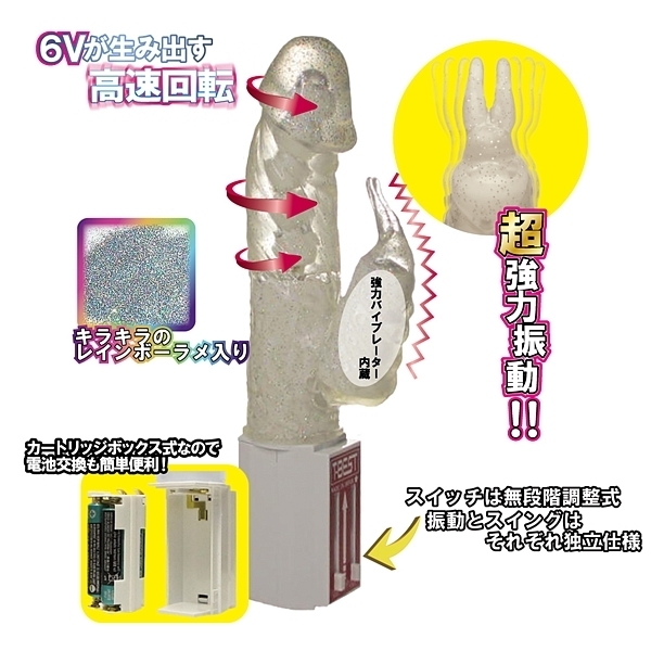 快感は無限に輪廻する…復活を遂げたくねりん棒シリーズから扱いやすいミドルサイズのハイパワーVER.が登場!レインボーラメも入ってキラッキラ☆彡6Vハイパワーが生み出す高速回転で、くねくねグリグリ ぐるぐるとこねくりまわす動きにもうメロメロ!絶頂、即イキ間違いなし!!さらに子機バイブは強力ローター内蔵で先端の突起がブルブル、ク●も同時に快感刺激!!電池を入れればすぐに使える楽々コントロールBOX、しかもカートリッジ式で電池交換も簡単便利!スイッチは振動とスイングがそれぞれ独立、無段階調整式でお好みの速度でお楽しみいただけます。単4電池4本使用(アルカリ電池推奨) 静音タイプ!安心・安全の日本製
