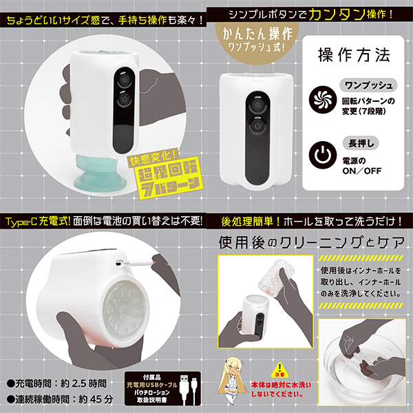 高速パワフル回転のコンパクト電動オナホの登場です!マンネリしない多彩な7パターンのトルネードフェラに絶対絶頂!初心者にも優しく使いやすい電動ホールです。シンプルボタンでカンタン操作!ホールを取って洗うだけなので後処理簡単!重量約440Gのちょうどいいサイズ感で手持ち操作も楽々!インナーホールは高弾力でもっちりしている耐久性抜群の素材を使用。肌に吸い付くような濃密でリアルな挿入感をぜひ体験してみてください。360°びっしりの駆け回る螺旋イボが無限に刺激してきます!直接肌に触れるものだから、安全性と感触にこだわった高品質なエラストマーを使用しています。パッケージイラスト:MARUKU
