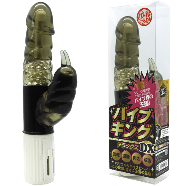 ハリ弾力のある肉太3段ボディ×ペロペロ舐める2本触手の子機が快感を高める!累計販売数50万本も売り上げた大人気シリーズ「バイブキング」の新作が登場。個別操作可能な強力回転&スイングの刺激に加えて根元部分にパールを内蔵したことで快感アップ!挿入部は約10cm、幅3.6cm、重さ228gの人気の高いスモークカラーで仕上げた電池式バイブです。単三電池を3本使用